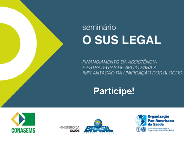 Nos dias 25 e 26 de abril de 2017, o Ministério da Saúde (MS), a Organização Pan-Americana da Saúde (OPAS) e o Conselho Nacional de Secretarias Municipais de Saúde (CONASEMS) irão promover em Belo Horizonte, o Seminário SUS Legal, Financiamento da Assistência e Estratégias de Apoio para a Implantação da Unificação dos Blocos. O evento tem como objetivo apoiar a gestão municipal que se inicia.