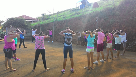 A fisioterapeuta do Núcleo de Apoio à Saúde da Família (NASF) realiza, quinzenalmente, as terças-feiras, uma aula de alongamento para moradores do bairro Aterrado, localizado na zona rural de São Sebastião do Rio Verde. A aula dura cerca de 50 minutos e possui até o momento, uma média de 15 a 20 participantes de todas as idades.